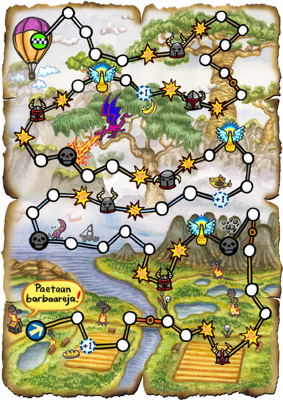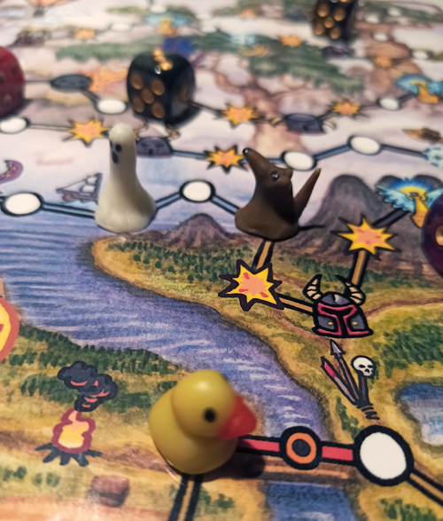 Mitäpä muuta... Tähän mahtuu vielä tekstiä. Meinasin myös askarrella omat erikoisnopat laudan tilanteita varten, mutta kadotin tilaamani tyhjät nopat jonnekin asuntoomme. Tavalliset nopat sopeltuvat myös näihin pelin vaiheisiin, mutta erikoisnopat olisivat olleet hauska lisä.